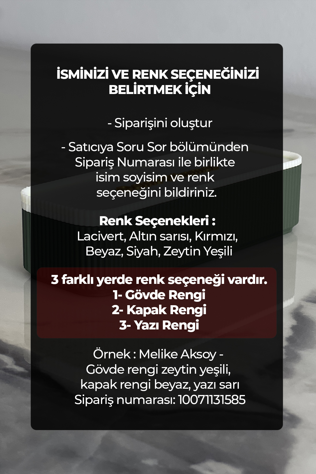Siparişi oluşturduktan sonra Satıcıya Soru Sor bölümünden isim ve renk seçeneklerini sipariş numarası ile birlikte belirtiniz.