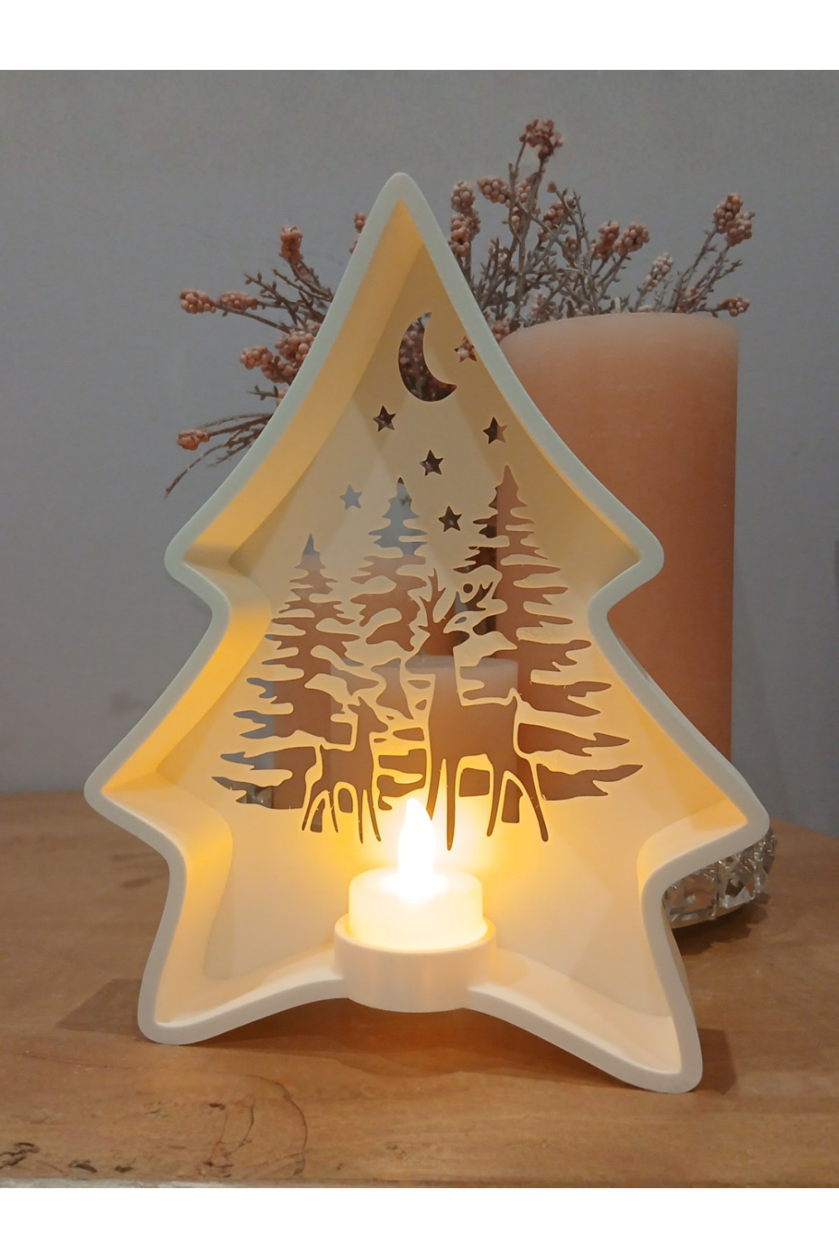 Çam ağacı formunda tasarlanan bu dekoratif LED mumluk, bulunduğu ortama sıcak ve huzurlu bir ambiyans katar.